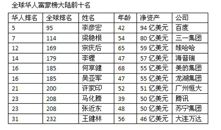 中國(guó)大陸地區(qū)首富為百度的李彥宏,他以94億美元的身家超過(guò)了前首富——娃哈哈的宗慶后(59億美元)。此外,三一重工的梁穩(wěn)根(80億美元)憑借去年三一重工股價(jià)的飆升,財(cái)富猛增122%,成為中國(guó)大陸第二富豪。宗慶后今年排在大陸富豪第三位。