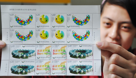 5月4日,一名集郵愛好者在展示她購買到的《深圳第26屆世界大學生夏季運動會》紀念郵票。當日,由中國郵政發(fā)行的《深圳第26屆世界大學生夏季運動會》紀念郵票在蘇州發(fā)行。該套紀念郵票一套4枚,內容分別為“會徽”“吉祥物”“大運中心”和“主題口號”,全套郵票面值6.6元。
