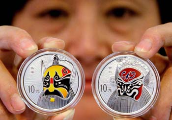中國人民銀行發(fā)行的中國京劇臉譜彩色金銀紀(jì)念幣(第1組)。這套紀(jì)念幣一套3枚,其中金幣1枚,銀幣2枚,均為中華人民共和國法定貨幣。新華社發(fā) |