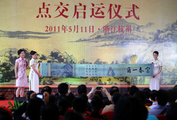 點(diǎn)交儀式前浙江博物館工作人員根據(jù)一幅《富春山居圖“剩山圖”的復(fù)制品進(jìn)行講解。記者 韓傳號/攝 |