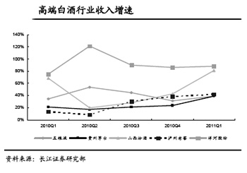 白酒行業(yè)、啤酒行業(yè)、葡萄酒行業(yè)、乳制品行業(yè)和其他食品飲料公司在2011年一季度保持了20%以上的收入增長,其中白酒行業(yè)收入增速提升至49%。食品飲料行業(yè)總體在2010年和2011年一季度收入高速增長,白酒行業(yè)在食品飲料細(xì)分行業(yè)中表現(xiàn)出了收入強(qiáng)勁增長的趨勢。從2011年一季報(bào)收入、成本、費(fèi)用變化趨勢看,我們認(rèn)為白酒行業(yè)仍然是2011年業(yè)績高增長的行業(yè)。