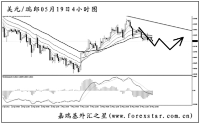 ▲美元兌瑞郎的反彈最終受阻于日線圖的下降趨勢線及均線系統(tǒng),匯價短線下行調(diào)整,在對前期的漲幅進(jìn)行修正。4小時圖MACD顯示下跌動能充足,關(guān)注0.8705一線的支撐力度,此位置為道氏低點,同時也是此前上漲的61.8%幅度回調(diào),預(yù)計匯價跌到此位置后有望重新轉(zhuǎn)為上行。