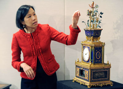 6月1日,香港佳士得拍賣(mài)行將在2011年春季拍賣(mài)期間舉行“重要中國(guó)瓷器及工藝精品”專(zhuān)場(chǎng)拍賣(mài)會(huì),本次拍賣(mài)將呈獻(xiàn)470多件藝術(shù)珍品,總估值約10億港元(1.28億美元)。 圖為傳媒預(yù)展上工作人員正在介紹清乾隆年間的鎏金銅鑲嵌琺瑯料石轉(zhuǎn)花花盆頂水法音樂(lè)鐘,估價(jià)1800萬(wàn)至2500萬(wàn)港元。