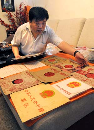 今年50歲的張建洛,是河南省洛陽市的一名普通市民。他從30多年前就開始收藏各種唱片和留聲機。在他收藏的15000多張唱片中,有一套經(jīng)過精心整理的“國歌唱片檔案”格外惹人注目。據(jù)史料記載,《義勇軍進行曲》從1934年誕生,到新中國成立后被定為代國歌、共有16個版本,張建洛收集了所有版本的唱片,包括1934年的電影《風(fēng)云兒女》插曲《義勇軍進行曲》,1941年美國著名黑人音樂家保羅?羅伯遜演唱的《義勇軍進行曲》,1949年《義勇軍進行曲》作為代國歌在開國大典上演奏的音樂版,1978年經(jīng)過重新填詞的“新”國歌等,張張堪稱經(jīng)典。張建洛準(zhǔn)備將他的國歌唱片在建黨90周年時,用它收藏的東方紅牌留聲機播放給市民聽,和大家一起分享歷史的回聲。