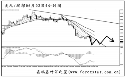 ▲美元兌瑞郎再度強悍創(chuàng)出新低,由于下方已沒有任何可以阻擋住匯價下跌的支撐位,所以我們無法根據(jù)價位來預(yù)測瑞郎何時能夠見底回升。現(xiàn)在短中線的主客觀方向均向下,操作只能是以繼續(xù)做空為主思路。首先關(guān)注圖中最近一條下降壓力線的阻力,預(yù)計美瑞突破此線的概率較大,進而挑戰(zhàn)0.8550附近區(qū)域。