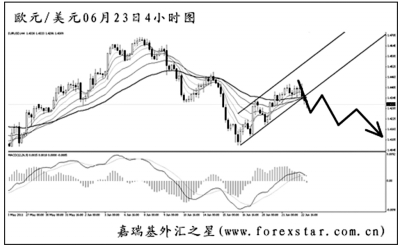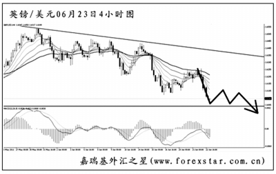 歐元兌美元小幅跌破了圖中的上升通道下沿,最近的下跌趨勢(shì)仍在延續(xù)。從日線圖上看,此輪歐元要挑戰(zhàn)的目標(biāo)仍然為5月下旬的低點(diǎn)1.3970,跌破方可打開進(jìn)一步的下行空間。雖然圖中的均線系統(tǒng)被小幅升穿,但由于此前的反彈力度始終不強(qiáng),預(yù)計(jì)后市歐元將以震蕩下行的走勢(shì)為主。