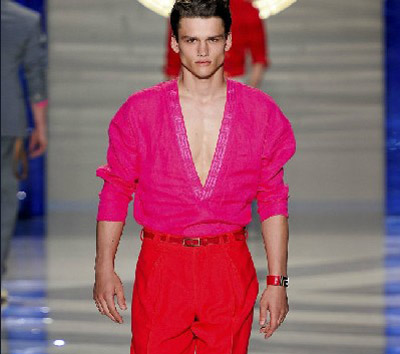 設(shè)計(jì)師Donatella Versace用柔軟的皮革面料來(lái)打造寬松及膝短褲與西裝,讓看似休閑感的廓型呈現(xiàn)出華麗,強(qiáng)硬的氣勢(shì),衣襟處、褲裝側(cè)面都加上了大量的金屬搭扣裝飾,來(lái)進(jìn)一步展現(xiàn)男性的剛強(qiáng)氣概。敞開(kāi)穿著的寬松條紋長(zhǎng)袍、絲質(zhì)V領(lǐng)襯衫帶來(lái)了海灘度假感覺(jué),同時(shí)也仍是硬朗派型男們展示身材的絕佳“武器”。