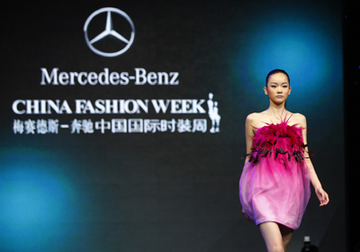7月26日,梅賽德斯-奔馳中國國際時裝周新聞發(fā)布會在北京舉行。中國國際時裝周組委會宣布賽德斯-奔馳正式冠名中國國際時裝周。據(jù)了解,每年兩季的梅賽德斯-奔馳中國國際時裝周的開幕季計劃于10月底在北京推出。圖為模特在發(fā)布會上展示中國時裝設計師的新作。
