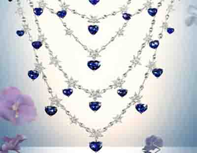 這款由形狀各異的鉆石與心形切割藍(lán)寶石組成的五排項鏈,完美詮釋了蕭邦高雅精致、無與倫比的高級珠寶創(chuàng)作傳統(tǒng)。