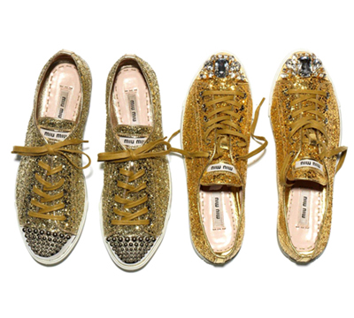Miu Miu(繆繆)這雙鞋子有木有閃到你!運(yùn)動(dòng)休閑范兒,也可以這么華麗。層層金色,閃閃發(fā)光,簡(jiǎn)直太配金秋季節(jié)了。 橡膠的鞋底,鞋上還配有金屬鉚釘和鉆石,加上金色的涂層,金色的鞋帶,張揚(yáng)的個(gè)性與時(shí)尚氣息并存。不做淑女,不走婀娜的步伐,要的就是大氣和率性。 在Miu Miu 秋季秀場(chǎng)上,如果說T臺(tái)是一條悠長的銀河,那么這雙鞋便是銀河里最最耀眼的星!