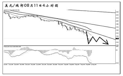 美元兌瑞郎繼續(xù)著其連續(xù)創(chuàng)新低的走勢(shì)。由于瑞郎最近處于極端強(qiáng)勢(shì)的走勢(shì)中,且下方?jīng)]有任何有效支撐,短線匯價(jià)即使展開一小波調(diào)整,但升破圖中下降趨勢(shì)線及均線系統(tǒng)的希望也不大,后市美元兌瑞郎仍將以回調(diào)后繼續(xù)走低的趨勢(shì)為主。