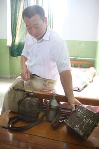 今年47歲的李俊波是河北省滄州市煉油廠的一名普通職工,從1996年至今,他致力于收藏侵華日軍物證,10多年來,他收集當年八路軍繳獲日軍而流落民間的物品有日軍軍服、鋼盔、子彈、手套、煙盒、水壺、飯盒、紀念章、軍事地圖、馬刀、指揮刀、槍刺……