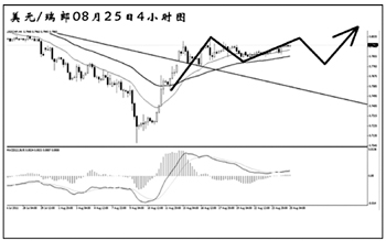 美元兌瑞郎近期強力反彈,接連升破了兩條下降壓力線的阻力,同時,圖中均線系統(tǒng)已經(jīng)形成依托排列,瑞郎的強勢基本告一段落。目前匯價持續(xù)在對此前的上漲進行修正,短線調(diào)整結束之后有望繼續(xù)上行,向周線圖的趨勢線阻力0.8300一帶挺近。