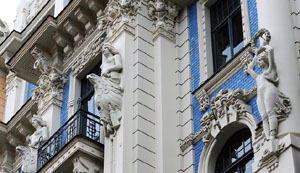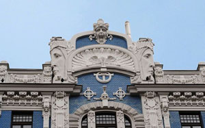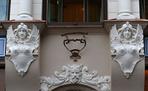 阿爾伯特街、斯特拉涅庫街和伊麗莎白大街是新藝術(shù)建筑最集中的區(qū)域。我們來到阿爾伯特街轉(zhuǎn)角處的一所建筑,拍攝整個公寓大樓必須要在路口的另一側(cè),因為街道很狹小,每次試圖拍攝這些建筑全景都不容易。沿著Kronvalda bulvaris街走到盡頭,一一經(jīng)過那些古老華麗建筑,它們的外立面非常有特色,裝飾性的浮雕石像,從武士、女神、半人半獸、各種動物、植物,甚至斯芬克斯,還有面具都可以堂而皇之地出現(xiàn)在建筑的某個部分,讓人吃驚不已?梢哉f里加這一風格的建筑幾乎代表了全世界新藝術(shù)派風格的最高成就。