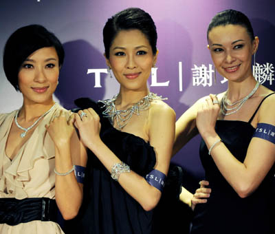 眾模特在香港旺角展示謝瑞麟珠寶集團的皇牌系列——Estrella美鉆,該系列美鉆為100瓣獨特切割面,并呈現(xiàn)“9心1花”圖案,璀璨耀眼,獨具魅力。