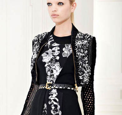 女郎顯得更加優(yōu)雅干練,網(wǎng)眼面料的輕盈感使皮裝不會顯得過于硬朗、沉重。復(fù)古緊身胸衣式的上半身輪廓、柔軟而富有曲線美的裙擺、細(xì)密閃亮的金屬扣環(huán)裝飾、清爽和諧的配色,融合成優(yōu)雅而富有藝術(shù)感的氣質(zhì)。連身裙則在不對稱剪裁上大做文章,肩部的挖空設(shè)計、不規(guī)則的裙擺將線條清晰的建筑感與裙裝的飄逸感融為一體,黑白條紋、棕櫚葉子和木槿花圖案作為裝飾,有幾分抽象畫的感覺。