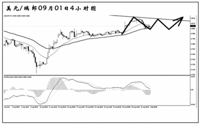 澳元兌美元經(jīng)過了一小段調(diào)整之后繼續(xù)上行,整體來看仍然在對此前的下跌進行修正,但圖中均線系統(tǒng)已經(jīng)形成依托排列,短線的漲勢再度確立。從動能角度考慮,后市澳元仍有進一步上沖的欲望。但再度突破1.1080的前方高點希望不大,如若做空需首先等待下跌動能的爆發(fā)方可進場。