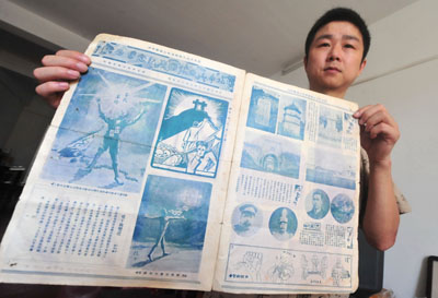 圖為彭偉在展示一件1930年出版的“湖北中山日報國慶紀(jì)念圖畫增刊”原件。