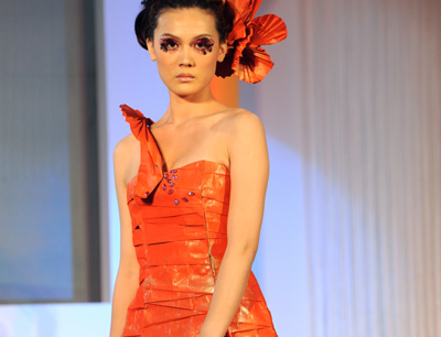 在臺(tái)北舉行的“第二十一屆臺(tái)北國(guó)際化妝品展”上,彩妝師王薇利用宣紙、棉紙、牛皮紙等為材料,運(yùn)用折疊、編織等手法,制作出別具特色的創(chuàng)意婚紗,頗為搶眼。圖為模特在展示用紙制作的創(chuàng)意婚紗。新華社發(fā)