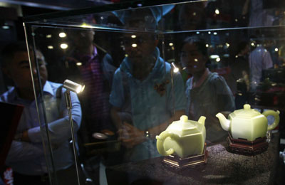 十件曾在上海世博會(huì)新疆館內(nèi)展出的和田玉真品日前在滬拍賣,這些拍品大多出自國(guó)家級(jí)玉雕大師之手,總成交價(jià)近千萬元。 圖為觀眾正在參觀成交價(jià)達(dá)250萬元的拍品——六棱對(duì)壺。