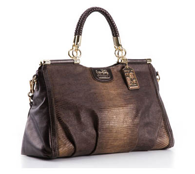 Caroline的外觀融合了Coach公文包的暗銷。設(shè)計(jì)工藝采用深淺對比的同色壓花蟒蛇皮和鱷魚皮以及珠光和金色光滑皮革。金屬配件為14K金和拋光琥珀色鍍層相結(jié)合。