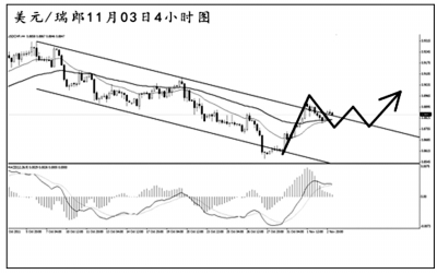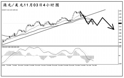 澳元兌美元的此波下跌將圖中的上升趨勢(shì)線跌破,均線系統(tǒng)已經(jīng)形成壓制排列。澳元重新挑戰(zhàn)1.1000的進(jìn)程再度受阻,預(yù)計(jì)后市繼續(xù)發(fā)生下挫的概率較大。4小時(shí)圖MACD仍處于空頭動(dòng)能充盈的階段。澳元若發(fā)生回調(diào),也很難重新升破趨勢(shì)線,操作上以小倉(cāng)做空為主。