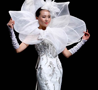 “名瑞杯·中國(guó)婚紗設(shè)計(jì)大賽”在中國(guó)國(guó)際時(shí)裝周上舉行,江南大學(xué)紡織服裝學(xué)院的王惠獲得金獎(jiǎng)。圖為模特在展示參賽作品。