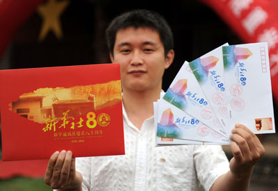 圖為瑞金市一位市民在展示《新華社建社80周年》紀(jì)念郵戳。