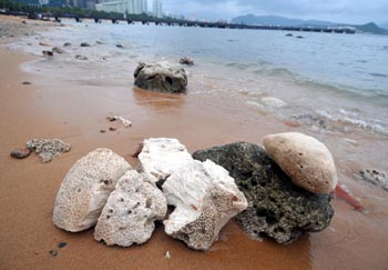 三亞大東海海邊到處可見被打成小塊的珊瑚礁以及碎片。記者