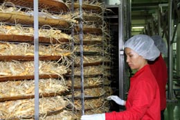 戴上頭套和腳套,我們懷著好奇的心情走進(jìn)工廠,一一觀看各道生產(chǎn)工序。天然的人參經(jīng)由機(jī)器清洗后,通過傳送帶被送至蒸箱,完成了最關(guān)鍵最核心的蒸參環(huán)節(jié)后,顏色變紅,又通過傳送帶,被碼放到曬盤。自然晾曬20多天后,再由有經(jīng)驗(yàn)的工人手工篩選,分為天、地、良三種級別。其中,天字號紅參為頂級,是上等的國禮,據(jù)說在1995年中國國家主席訪問韓國時(shí),韓國贈送了10支“天參”。