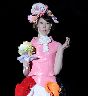 一名模特在日本東京舉辦的東京甜品展覽上展示用甜品做的頭飾和花束。