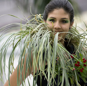 在哥倫比亞卡利市舉行的生態(tài)時(shí)裝展上,一名模特展示設(shè)計(jì)師作品。據(jù)悉,本次時(shí)裝展上展出的所有服裝都是用天然材料和活植物制作的。