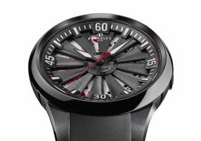 該腕表采用了鉆石狀涂層工藝(DLC)的44毫米純鋼表殼,并裝備了獨特的雙擺錘全自動P-181機芯。摒棄了繁瑣的功能設計,采用簡潔的表盤設計,使時間讀取無比清晰簡單。