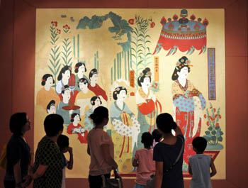 今夏“博蘊華光敦煌藝術展”在深圳開展,展覽展出內容主要包括原大敦煌石窟復制洞窟、壁畫臨本、藏經洞絹畫復制品、彩塑復制品、精品文獻等。新華社發(fā)(賀友保/攝) |