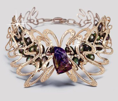 “Sea Duchess”項(xiàng)鏈?zhǔn)荓arry Jewelry最新系列“Sea of Colours”中的經(jīng)典之作,靈感來自傳說中珍奇靈動(dòng)的海洋生物蛟龍,其設(shè)計(jì)不但展現(xiàn)出新穎婉約的動(dòng)人線條,正中更鑲嵌珍貴罕見的50.73克拉雙色紫黃晶寶石,伴以24顆南洋黑珍珠、216顆約7.46克拉的啡鉆及500顆約4.32克拉的白鉆。