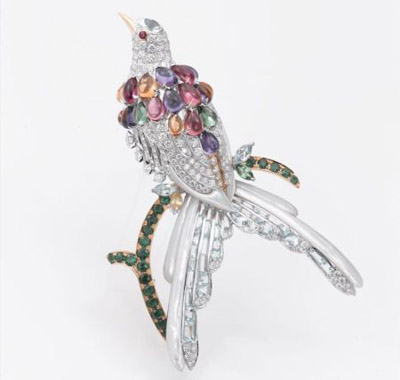形態(tài)優(yōu)雅的quetzal棲息于綠寶石18K黃金樹干,其身軀和頭部除鑲滿了白色美鉆外,背部亦披掛著不同色澤的梨形半寶石;修長的白金尾巴分別以鉆石及淺藍色半寶石點綴。