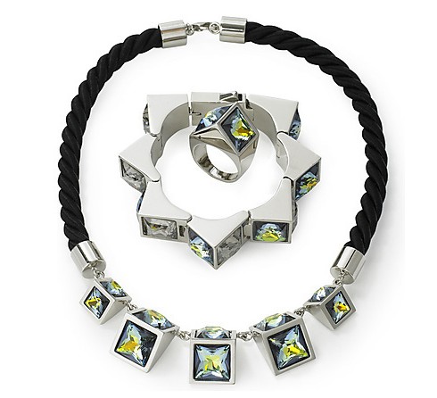 Atelier Swarovski是Swarovski與時(shí)裝、珠寶界頂尖設(shè)計(jì)師合作推出的極致奢華水晶配飾系列。2012春夏,Swarovski與服裝設(shè)計(jì)師Zaldy合作推出這個(gè)個(gè)性鮮明的配飾系列。方形珠寶嵌于銀色的三角斜面中,簡(jiǎn)潔不失立體感的配飾此次選用的施華洛世奇水晶主要是原色和黃色兩種。
