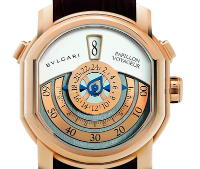 寶格麗 Papillon Voyageur ,DR1307機(jī)械式自動(dòng)上煉機(jī)芯 ,跳時(shí),Papillon 分鐘顯示,中央指針雙時(shí)區(qū)顯示,以及專屬