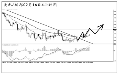 美元兌瑞郎升破了下降壓力線之后持續(xù)上揚(yáng),目前匯價(jià)正在考驗(yàn)0.9260的道氏高點(diǎn)阻力,4小時(shí)圖MACD多頭動(dòng)能充盈。從日線圖上看,若匯價(jià)重新升破均線系統(tǒng)的壓制,后市仍有機(jī)會(huì)繼續(xù)沖擊前高0.9595一線的阻力。短線等待調(diào)整節(jié)奏出現(xiàn)后可繼續(xù)做多。