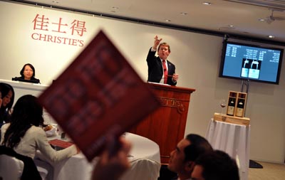 圖為香港佳士得舉行的亨瑞·賈耶私人窖藏勃艮第佳釀拍賣會現(xiàn)場。