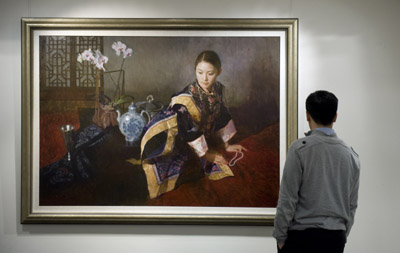 圖為蘇富比工作人員在觀看畫家陳衍寧的作品《夜深沉》,估價(jià)120萬至180萬港幣。