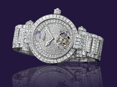 陀飛輪腕表滿足瑞士官方天文臺認證的所有苛刻要求。腕表具備時、分顯示,位于6時位置的一分鐘陀飛輪設小秒針顯示,12時位置設有鑲嵌長方形切割鉆石和紫水晶的拱形動力儲存顯示功能。 雪花鑲嵌法 18K白金表盤運用雪花鑲嵌法,使用不同直徑的明亮式切割鉆石進行鑲嵌,是一種極難掌握的鑲嵌工藝,同時以長方形切割鉆石相環(huán)繞,動力儲存顯示采用紫水晶鑲嵌刻度。白金表冠鑲嵌長方形和水滴形切割鉆石。表圈、表耳和表帶則鑲嵌橢圓形蛋面切割鉆石、長方形切割鉆石。6時位置陀飛輪表橋采用