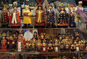到仁寺洞旅游的外國游客,一定會(huì)被這里遍布各處的文化商品所吸引,就連已經(jīng)去過無數(shù)次的我,面對各種精致可愛的工藝品,也常常流連忘返。仁寺洞最受歡迎的商品要數(shù)陶器,英國伊麗莎白女王曾經(jīng)訪問過這里的“樸英淑窯”。改良的生活韓服也在仁寺洞大行其道,美麗精致的設(shè)計(jì)總令女顧客們愛不釋手。除此以外,物美價(jià)廉的韓國傳統(tǒng)生活用品也極受歡迎,漂亮的綢緞荷包、扇子和韓國結(jié)手機(jī)鏈等都是送禮佳品。熱愛古籍的朋友們,則在彌漫著書香的古籍一條街里久久駐足。