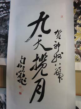 在“神舟九號(hào)”運(yùn)抵酒泉之際,4月7日,由當(dāng)代青年書(shū)法家、毛體書(shū)法傳承人周鵬飛手書(shū)、被“神舟八號(hào)”搭載的《九天攬?jiān)隆访w書(shū)法作品在“神舟八號(hào)”飛船成功返回地面后,在周鵬飛的個(gè)人書(shū)畫(huà)展上首次呈現(xiàn)在觀眾面前,引起了社會(huì)各界人士對(duì)航天事業(yè)的極大關(guān)注。前來(lái)欣賞的觀眾不僅目睹了“神八”帶回的珍貴墨跡,還觀賞到了由其大寫(xiě)意的18張丈二巨幅畫(huà)組成的《九州頌和諧》。