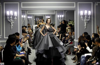 日前,眾多中外名流、明星、時尚界人士云集上海外灘“羅斯福公館”,觀看由迪奧女裝工坊首席設計師比爾·蓋特領銜設計的2012春夏高級訂制時裝秀。圖為模特在演繹迪奧的高級訂制時裝。