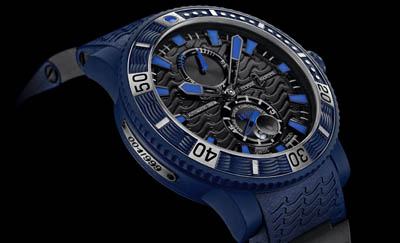 Blue Sea展示雅典表不斷進(jìn)步的制表技術(shù),是青春活力的象征。其直徑45.8毫米的不銹鋼表殼,經(jīng)過一個復(fù)雜的硫化過程(Vulcanization