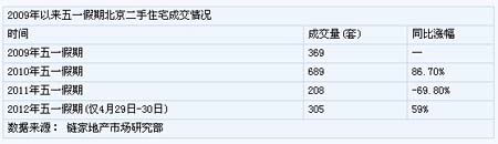 根據(jù)北京住建委網(wǎng)站的網(wǎng)簽數(shù)據(jù)統(tǒng)計,2012年“五一”假期頭兩天(4月29日-30日)北京全市二手住宅網(wǎng)簽總量為305套,與2011年“五一”假期頭兩天的網(wǎng)簽量相比上漲了54%;與今年清明假期頭兩天的網(wǎng)簽量相比上漲了535%。