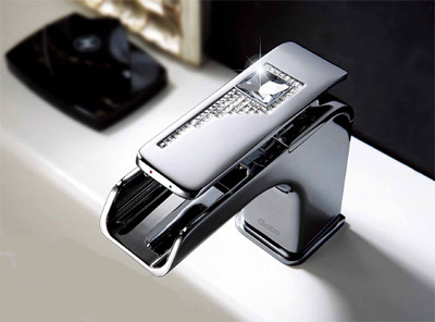 水晶衛(wèi)浴系列中的水龍頭,外形流暢大氣,表面鑲嵌水晶,靜靜地躺在水池邊發(fā)出閃爍的光芒,在你洗手的時(shí)候,水珠滑落手中的晶瑩,映襯水晶折射的燦爛,城堡中的君王,在鑲金嵌玉的洗手池旁,看到的恐怕也是這滿眼的BLING