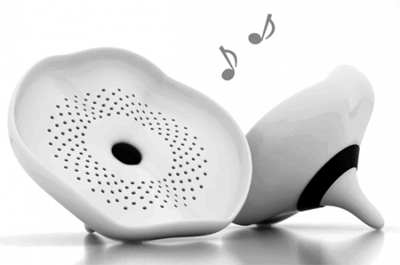 點(diǎn)子;外觀彷彿一片飄浮在水面上的蓮花荷葉,甚至感覺(jué)旁邊會(huì)隨著音樂(lè)節(jié)奏泛起一陣陣水波紋,葉面表面上更可見(jiàn)到無(wú)數(shù)細(xì)小的發(fā)聲孔,而音量調(diào)整器則配于背面黑圈上,光是外觀就令人印象深刻。