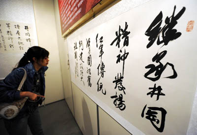 “神舟八號(hào)”所載書(shū)法作品《九天攬?jiān)隆放c觀眾見(jiàn)面